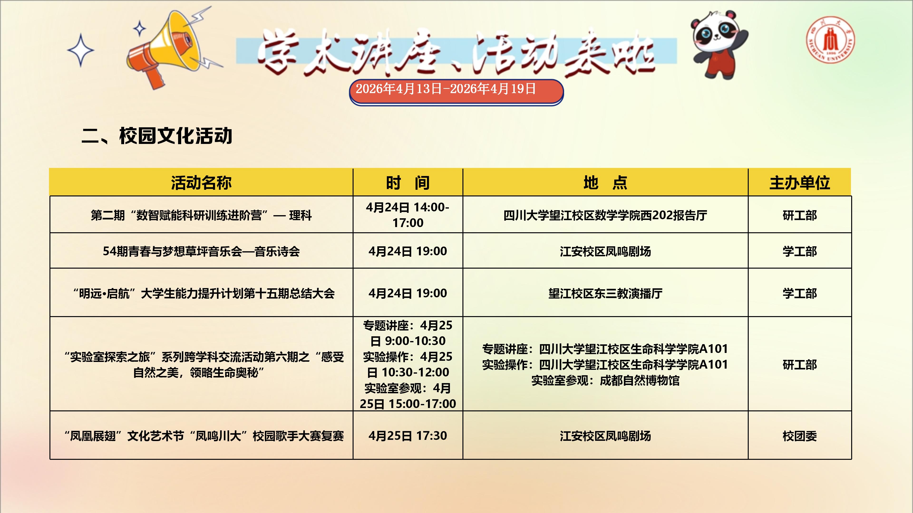 学术讲座与校园文化活动预告(2026年4月20日-2026年4月26日)