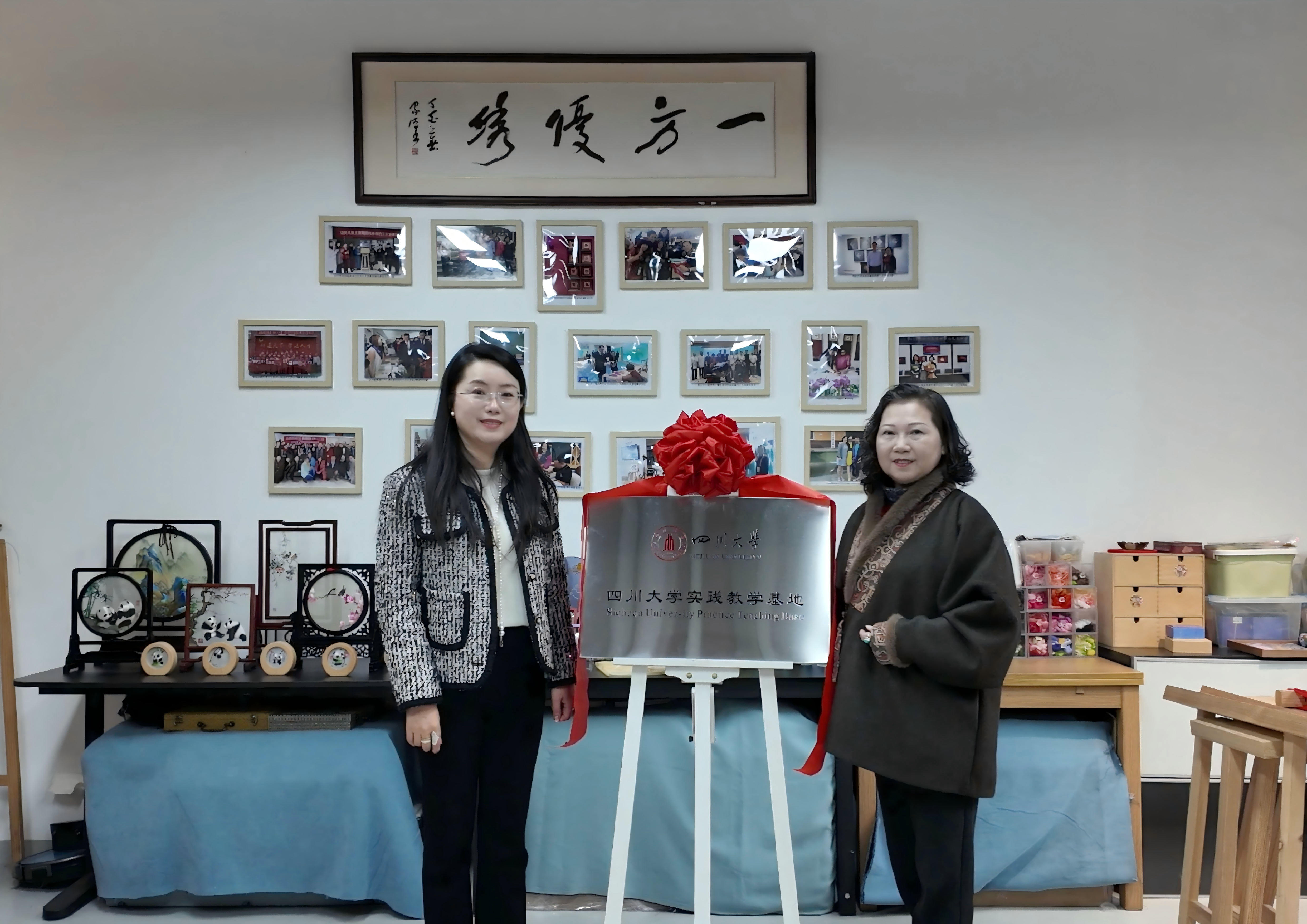 2025年11月17日,我校与国家级非物质文化遗产代表性项目——蜀绣四川省代表性传承人吴玉英工作室共建的实践教学基地正式揭牌成立。揭牌仪式在成都市东郊记忆吴玉英大师蜀绣工作室举行,四川大学轻工科学与工程学院服装与服饰设计系主任杨璐铭教授与吴玉英 共同为基地揭牌并合影留念。