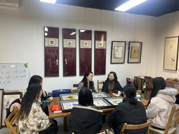 此次揭牌活动恰逢服装与服饰设计系第四期蜀绣实践学习顺利结业。本期学习小组由 4名本科生与1名硕士研究生组成,在为期三周的集中实践中,学生们在吴玉英大师指导下系统学习蜀绣的传统纹样与针法,完成了5幅蜀绣原创设计作品,进一步深化了学生对传统技艺的理解与创新表达。