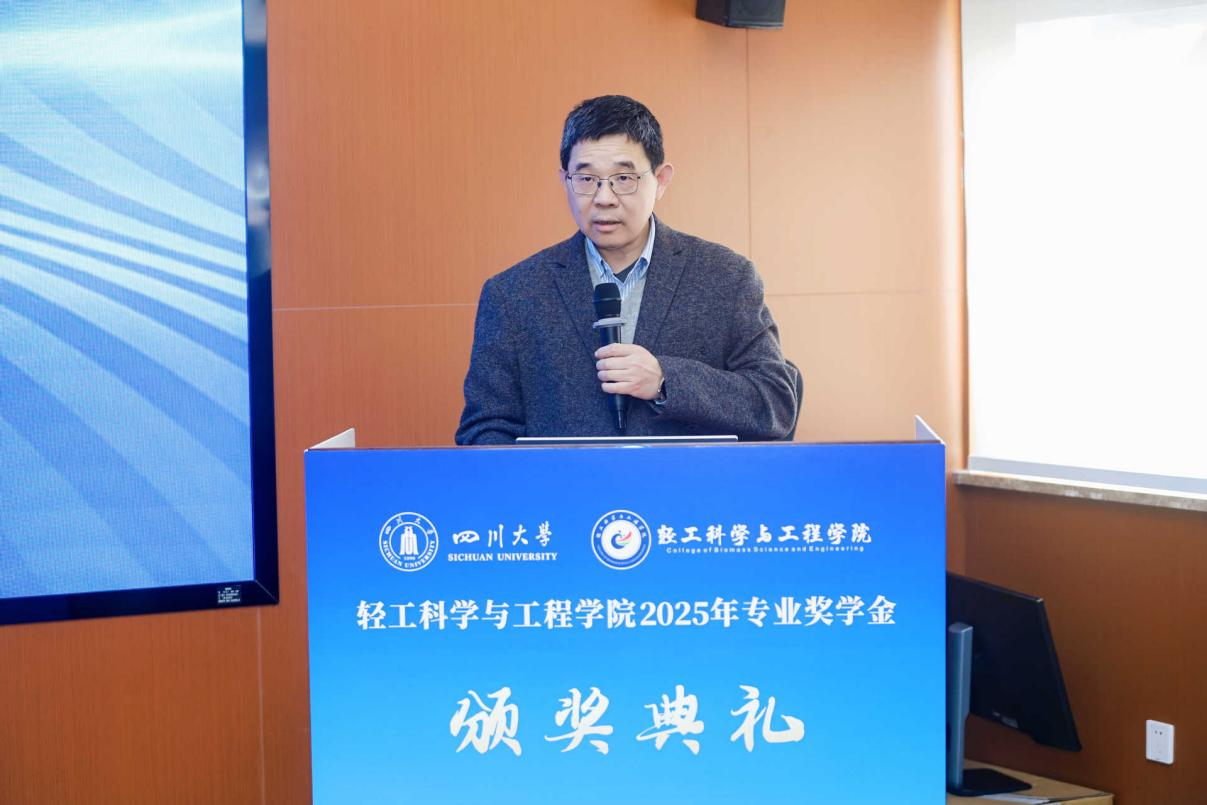 11月28日下午,轻工科学与工程学院2025年专业奖学金颁奖典礼在皮革楼互联网中心举行。中国皮革协会副理事长陈占光、德国司马化学有限公司皮革部中国区总经理张建华、斯塔尔精细涂料有限公司皮革事业部中国区区域销售经理涂刚、天津春发生物科技集团有限公司项目经理董婷等企业嘉宾,学院党委书记李天富、院长彭必雨,副院长周建飞、迟原龙等院领导,生物质与皮革工程系系主任林炜、副系主任程海明,食品工程系系主任吕远平等,与全体获奖师生共同参加典礼。学院党委副书记姜新主持。