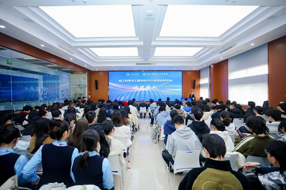 彭必雨院长宣读《轻工科学与工程学院2025年专业奖学金表彰决定》。在激昂欢快的颁奖音乐中,各位嘉宾与学院领导依次为获奖同学颁发荣誉证书,并亲切合影留念。