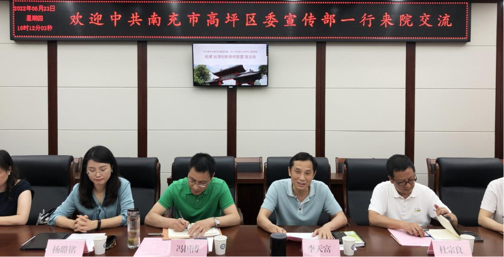 2022年6月23日下午,中共南充市高坪区委宣传部一行到访我院,就组建“丝源创新高校联盟”事宜进行座谈,学院李天富书记、冯国涛副书记,人才培养与科研管理办公室、纺织研究所、服装与服饰设计系相关老师参加了座谈。