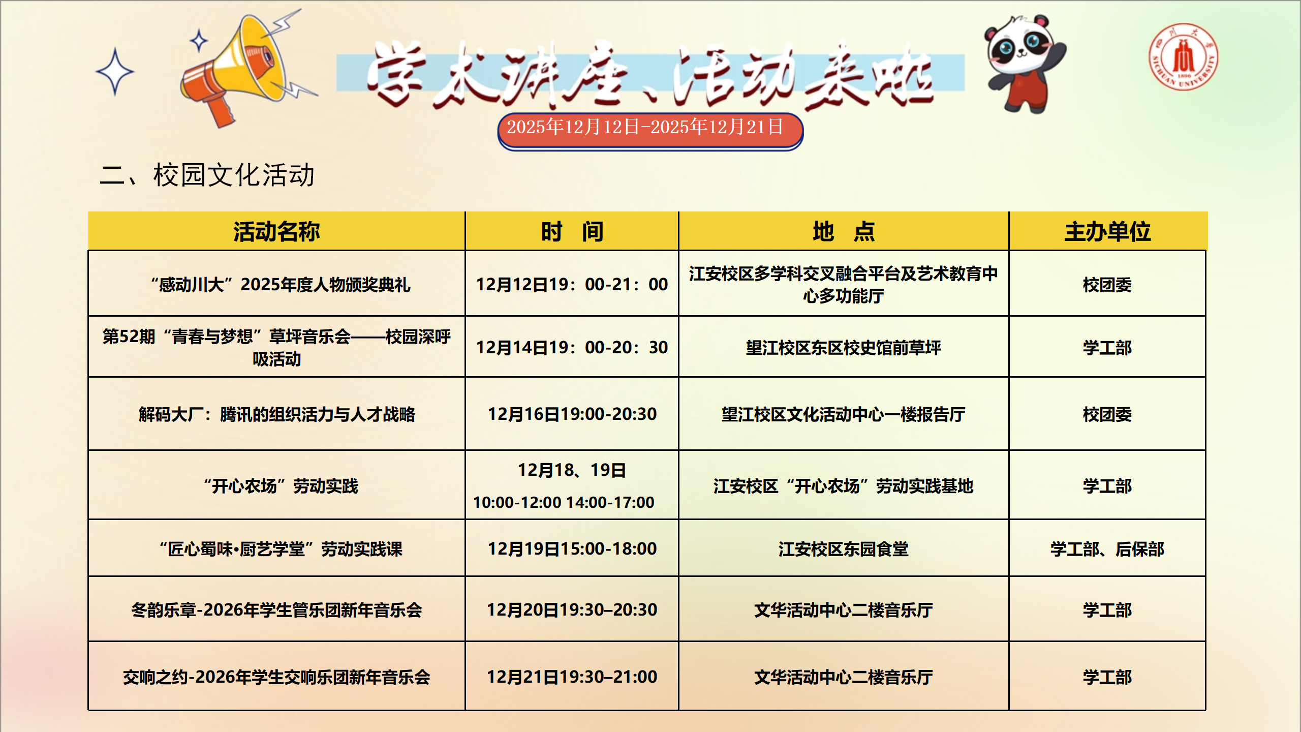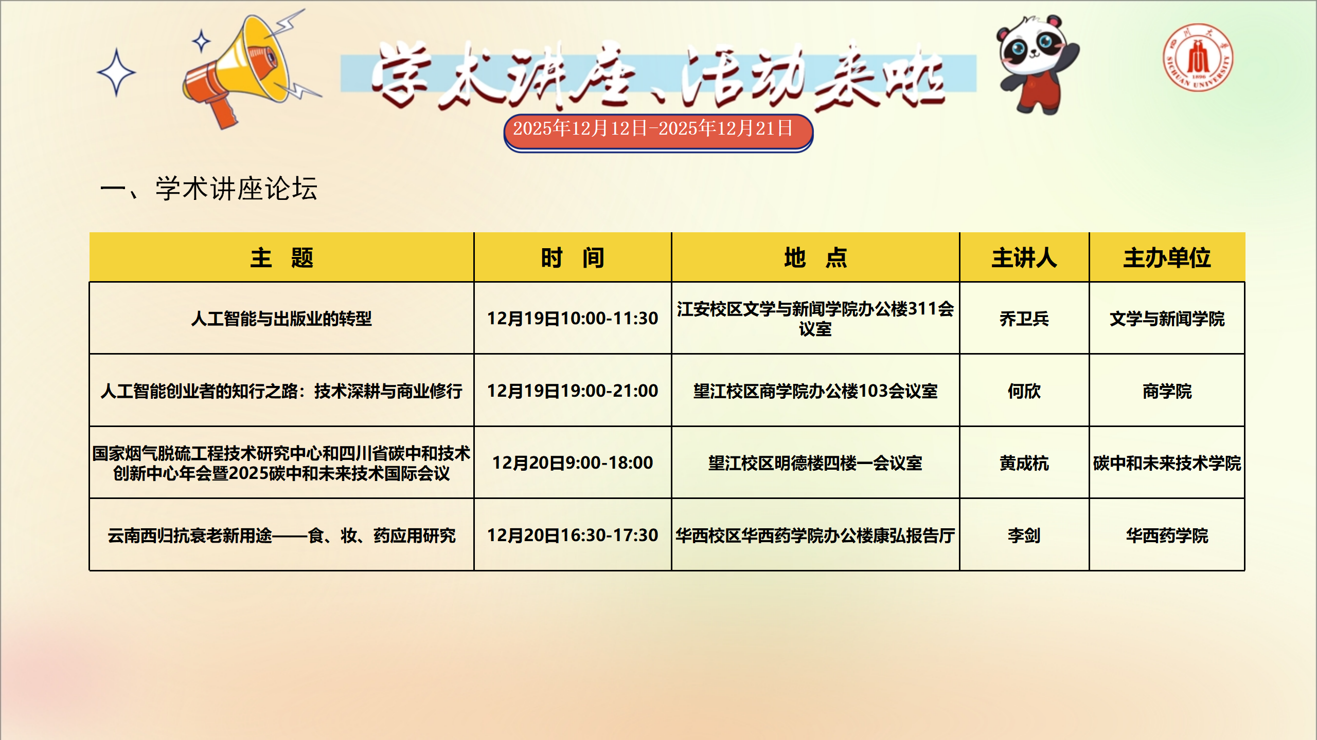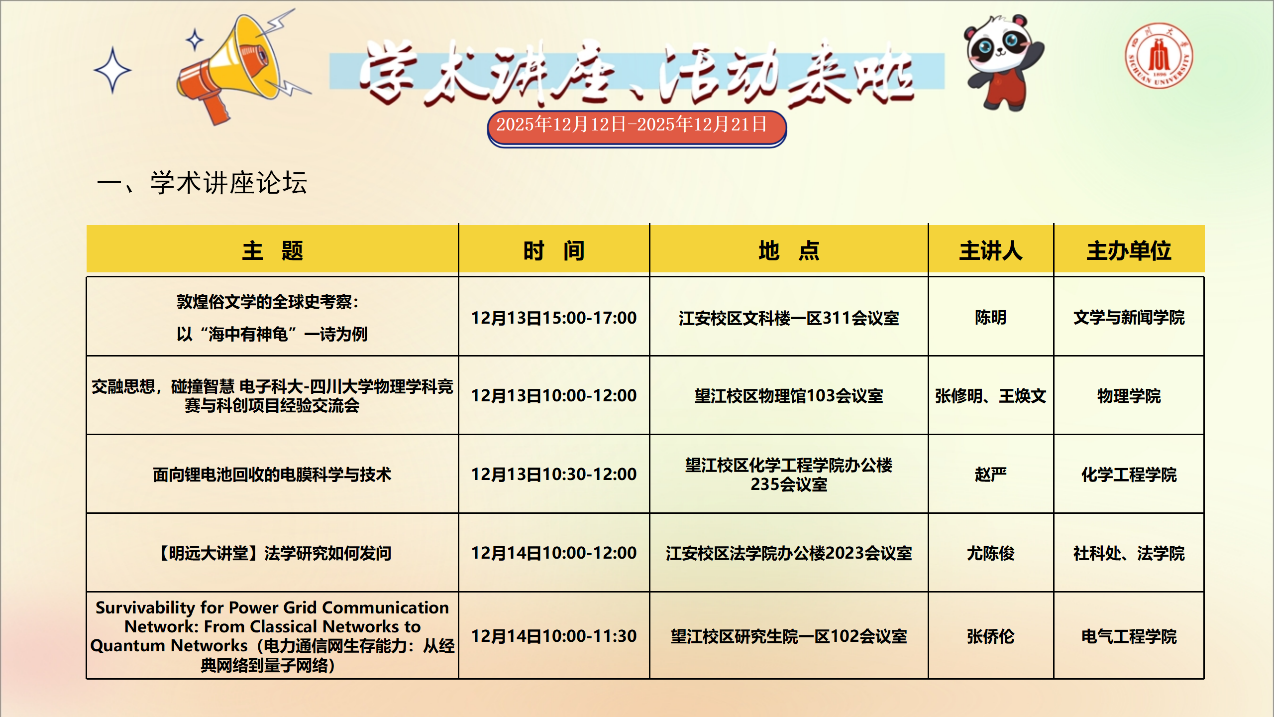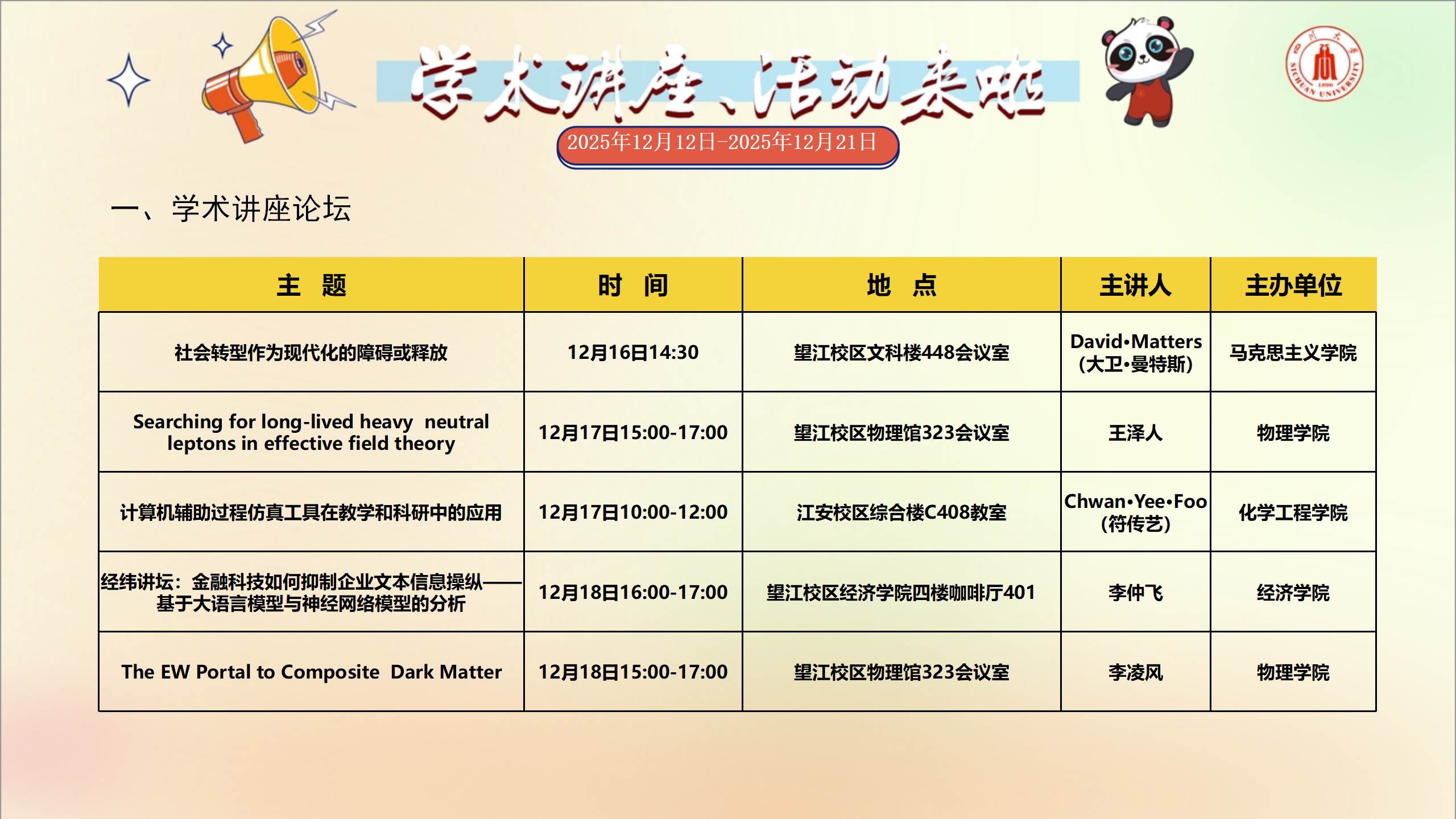 学术讲座和校园文化活动预告(2025年12月12日-2025年12月21日)