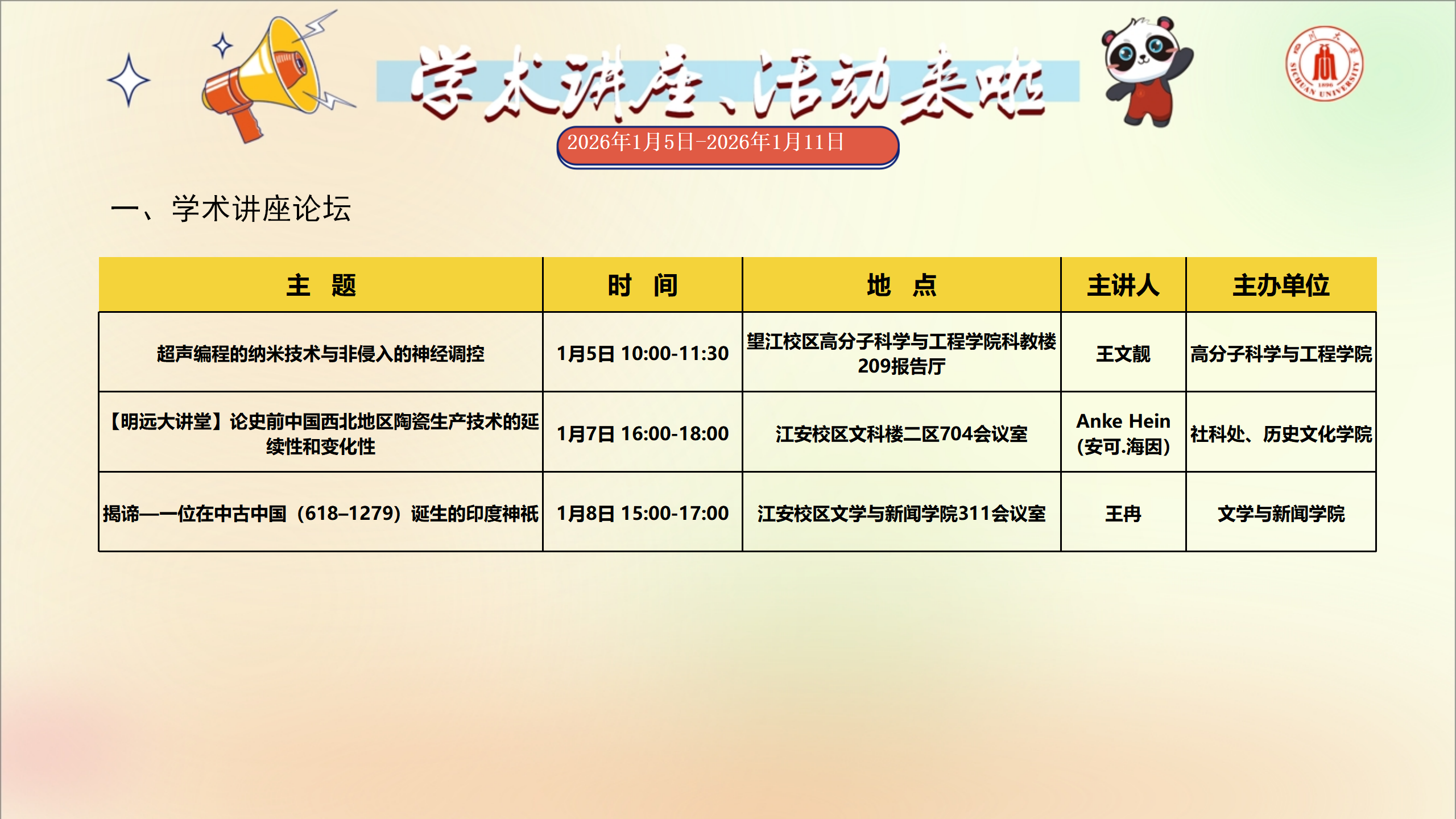 学术讲座和校园文化活动预告(2026年1月5日-2026年1月11日)